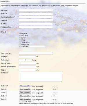 Mit unserem Web – Auftragsformular ist es Ihnen möglich Bestellungen in Echtzeit anzunehmen und zugleich den Datenaustausch über ein Upload Service mit eigenem angepasstem Front- und Backend im Corporate Design abzuwickeln.